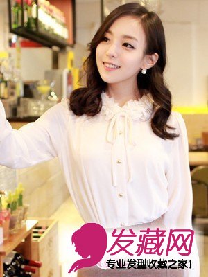 中分的发型是呈现女性轻熟味的发首先设计,清爽中显露出精致的脸庞,干净的明眸散发出动人的魔力。在发尾处烫出不同的卷度,发丝松散在肩上,营造出知性的气息,简单的白色雪纺上衣,加入梦幻的花辫衣领装饰,搭配高腰裙更加唯美。