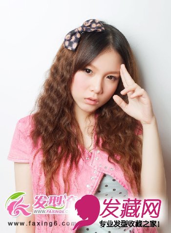 中分的烟花烫烫发发型,营造出了一个轻熟女的小资范儿,使本兮有着轻熟女的气质,细小的烟花烫,弧度十分的优美,蝴蝶结发饰的点缀,成熟中有不失甜美感。