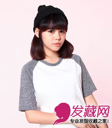 减龄的齐刘海齐肩发型,戴上编织的黑帽子,具有韩国小女生的淑女风范。