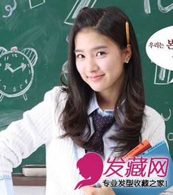 烫发的弧度大轻松让你告别老气,蓬松的烫发,修颜紧致脸部线条。刘海上挑露出额头清爽可爱,搭配校服,可爱的班花造型。