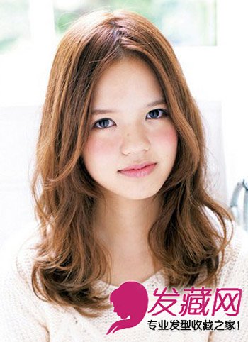 发型点评:这又是一款专为圆脸MM打造的中分发型,中分长刘海烫出唯美的弧线,沿着脸颊自然内扣,修颜显气质。波浪般的卷发自然柔和,UP清新气质。