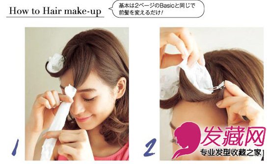 1、化妆前将额头前方的刘海中分成两束,然后用餐巾纸包裹好。