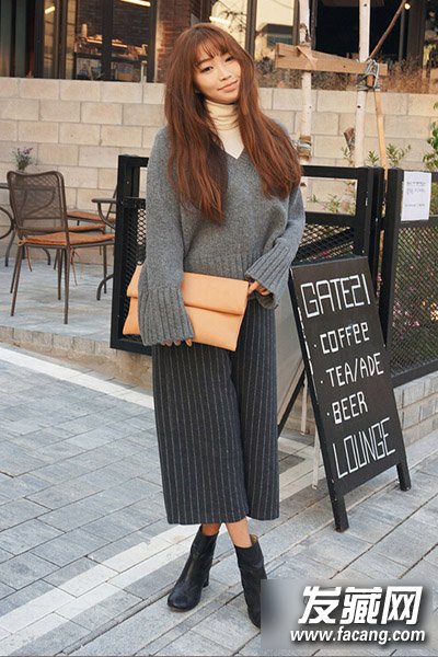 亚麻色的染发颜色,长发,半身裙,灰色系的搭配在冬天可是人气爆款,对于喜欢日系风格的妹子来说,这款造型值得尝试,空气感十足的齐刘海更是减龄利器,让女生看起来始终有一种少女般的纯美感觉。