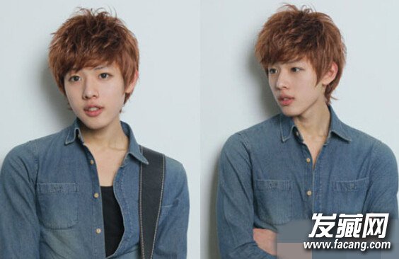 细碎的短发在经过烫卷后显得蓬松有型,从视觉上增加发量,完美修饰头型和脸型,搭配斜分得刘海塑造出韩式花美男形象,亮泽棕色的发色使整体发型看上去更加时尚帅气。