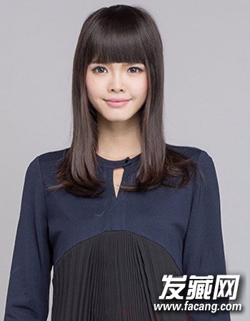 厚重的齐刘海造型设计可是最显女生十足的甜美可爱风了,而且还有简单的修颜效果,再搭配清新自然的乌黑发色与简单的内扣梨花头烫发同样甜美感十足。