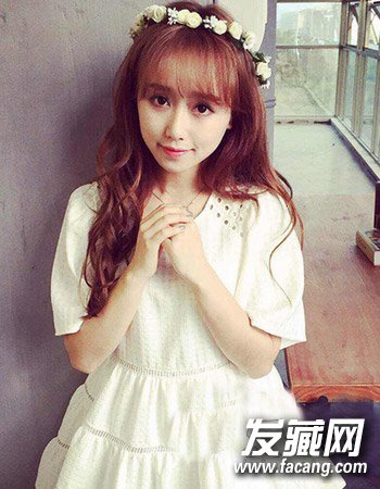 甜美的长发烫发与小圆脸搭配起来,可爱的空气刘海与气质的长发烫发搭配,不仅时尚而且颇有气质感,红棕色的染发颜色与花环搭配起来时尚大气。