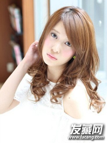 偏分式的刘海可以让眼睛看起来比较大,而且看起来比较光滑的刘海遮住额头,有种优雅、恬静的感觉,发尾的螺旋式烫发处理,十分别致好看,簇拥在肩头,衬托出一张精致小脸。