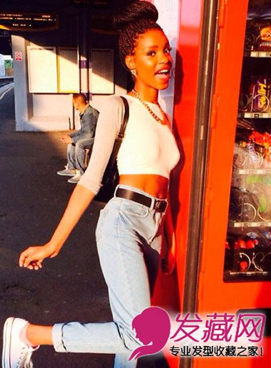 黑妹子的发型要效仿可是很有难度,首先你得把头发烫成一缕缕的黑人辫,之后再全部缠绕在头顶,以形成一个立体的、圆润的、特大号的花苞状。虽说我们无法将造型做到百分百相似,但我们至少可以在温度飚升之时,将头发悉数盘起,藉此获得清凉之感。