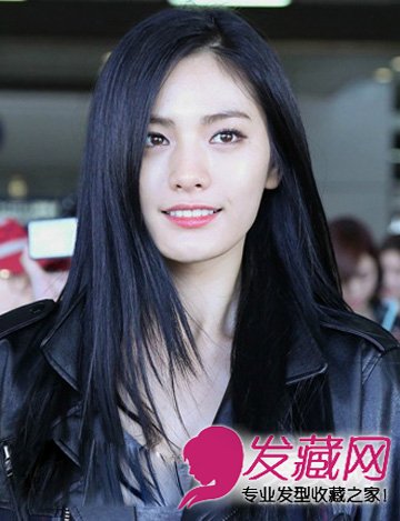 这款黑色款的长直发发型,呈现出一种东方女孩特有的独立直率感,侧分的修颜发型,黑皮衣,干练时尚。