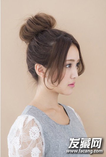 高耸的丸子头饱满蓬松,露出光洁的额头清爽吸睛。