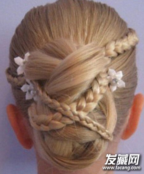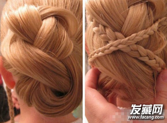 将丸子头盘成一个花样式的发髻,将盘好后的发髻用手指轻轻地拉松,营造出蓬松的感觉,然后再将左右两侧的小麻花编发,在大麻花编发发髻交叉重叠,将辫子剩余的发尾用黑色夹子藏于发髻里面,稍微用手在调整一下,一款漂亮的丸子造就完成了。