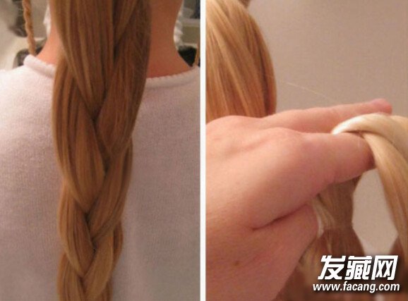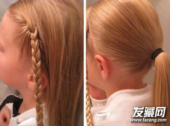 首先分别从两侧分出三股头发编成三股辫进行麻花辫发型编法,再用一根橡皮筋将剩下的头发绑成低马尾。