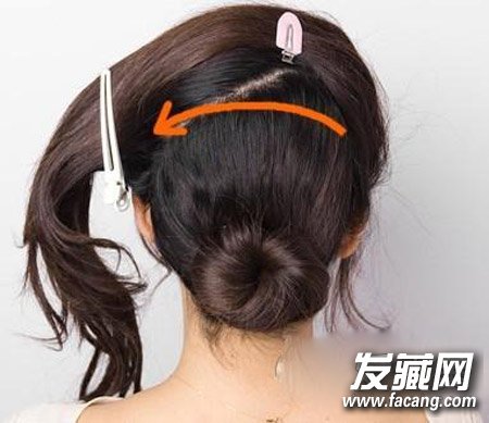 把头发分为耳前、耳后两部分。把耳后的头发扎成一个低马尾,然后扭转马尾辫将头发盘起来,最后用发卡固定成丸子头。耳前的头发使之全部偏向左右任意一边。