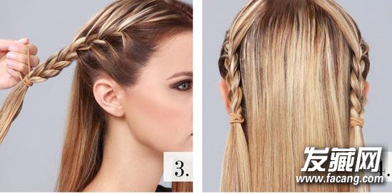 Step 3:编到一定位置的时候用皮筋固定住发辫,另一侧也做同样的处理。