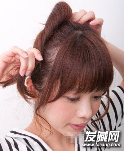 1.留出刘海位置,用梳子将头发梳成在头顶的马尾并用橡皮筋扎好。