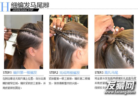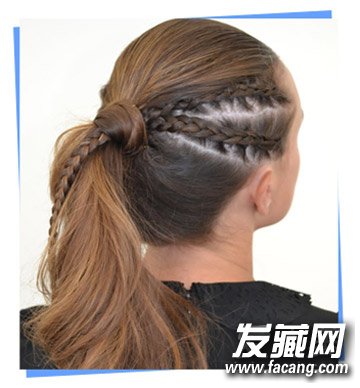 3、将编发的辫子扎成一个干练的马尾辫,扎高一点更精神,然后用一股头发遮住扎发出。