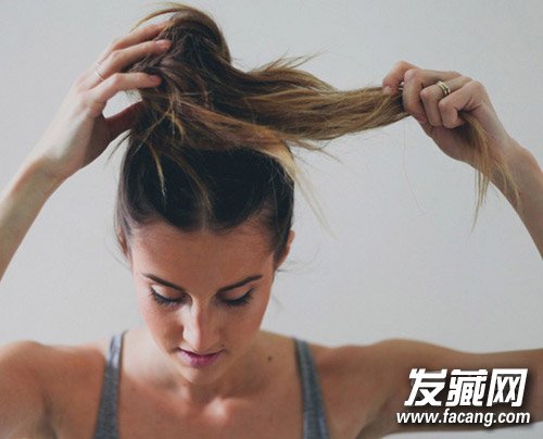 Step3: 左手抓住发尾,右手抓住马尾底部,将头发按顺时针方向绕着马尾底部盘起来;