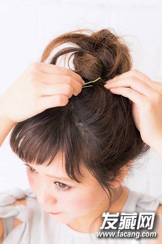 2,把比例4的发束扎成团子头。松松地卷在打结处,用发针牢牢地固定。