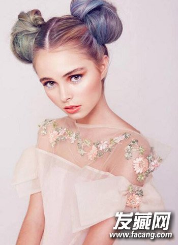 超时髦的女生发型,高扎的双丸子头发髻,看起来俏皮又具个性美感,渐变挑染的发色间,又是显露出最时尚风。