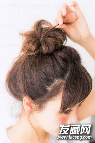 5,把剩下的发梢像要穿过在第四步中分开的团子头的正中那样卷起来。把发梢卷进橡筋里。