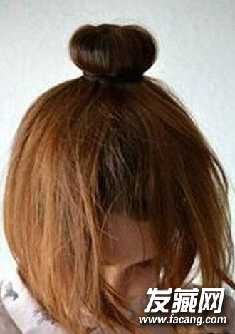 丸子头扎法图解step7:再将发尾朝下,包裹住发圈后用皮筋固定,做成一个丸子头。
