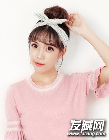 很有个性的一款花苞头盘发发型,甜美的空气刘海与花苞头扎发结合起来,而且搭配上蝴蝶结发饰显露出无比的清甜与时尚来。