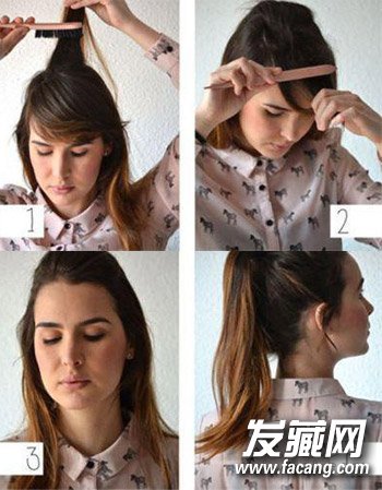 step 2:将刘海向后梳理先用小发夹固定出蓬松的效果,将剩余的发丝扎成高耸的马尾。
