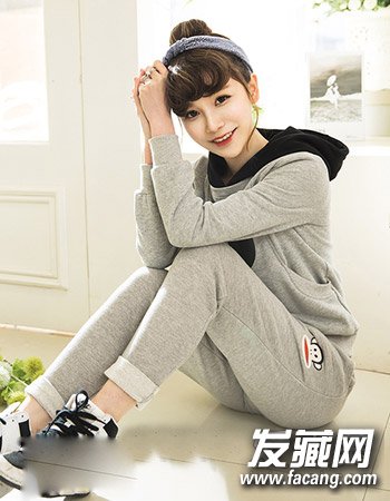 这是一款简单清爽又充满了运动范的女生丸子头发型,烫发设计的齐刘海很有设计感哦!整个造型非常的时尚。
