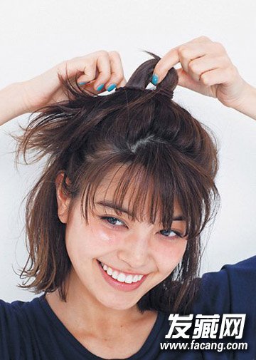 2,将1的头发折成两份,留下发梢绑成一个小小的丸子。