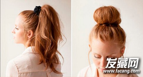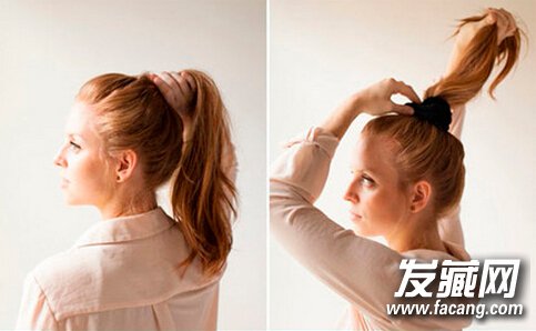 【丸子头编发step01】首先将头发全部高扎成一个长马尾,利用较大的发圈加以固定。