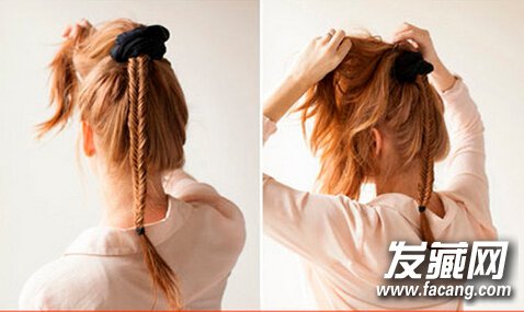 【丸子头编发step02】接着,从马尾中挑出大概四分之一的秀发编成一个鱼尾辫,编完之后利用一次性的橡皮圈固定即可,然后将剩余的秀发弄蓬松。