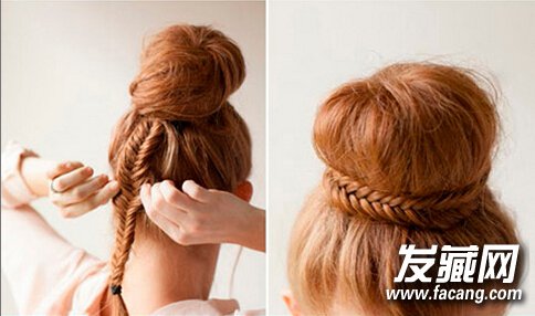 【丸子头编发step04】将绑好的鱼骨辫轻轻扯松,呈现出最蓬松的状态,然后就利用鱼骨辫围绕着丸子头盘旋起来,可以盘旋得稍微紧实些,最后用一字夹固定即可。