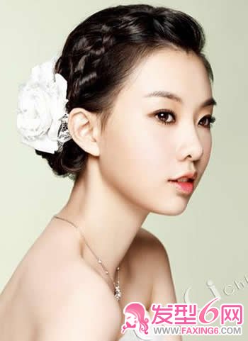 如果选择的是短款的婚纱,最好搭配活泼俏丽的可爱发型。可以在耳朵两侧选取一边,如图选择了左边编成麻花辫,然后用花朵发饰固定在后面。