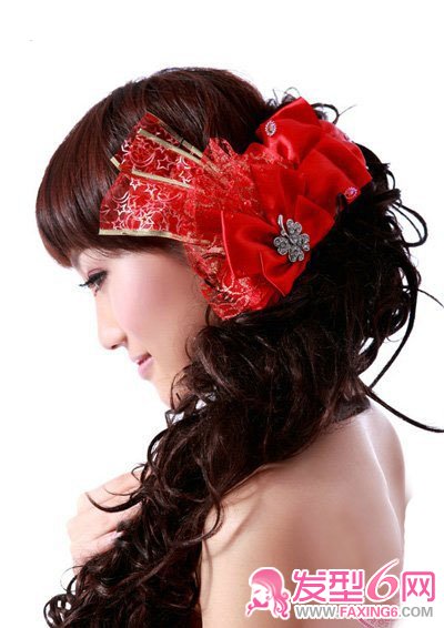 绸缎红蝴蝶结搭配金丝镶边蕾丝配饰点缀新娘发侧 浪漫风情。