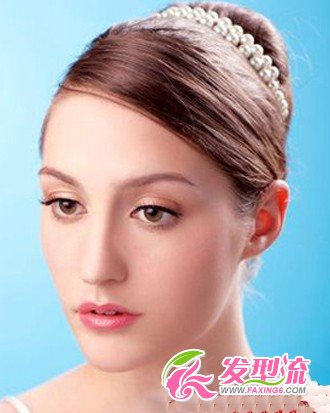 高耸的盘发打造出圆润饱满,发丝从满了丝滑感,利用珍珠链子营造出高贵和端庄。刘海整齐地服帖在额头,让新娘看起来清爽可人,透露出公主般的气息。