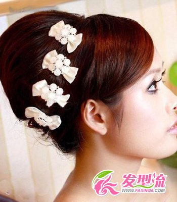 典型的韩式新娘发型,顺直的长发扎出一个整齐的大大的丸子头,把高贵优雅的气质展现得淋漓尽致。插上4个白色的精致蝴蝶结插针,带出甜美的气息。长长的斜刘海挽在耳后,半遮额头,可以起到修饰脸型的作用。