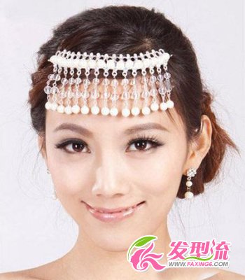 韩式最新新娘发型,烫过的秀发全部梳好盘起,发髻稍稍侧向一边,增加造型感。这款发型的最大的亮点就是珠子流苏头饰了,显得十分高雅,打造浪漫甜美的梦幻公主气息。
