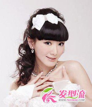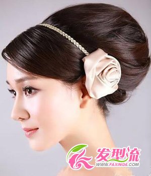 这款新娘发型图片,同样是很显高贵优雅气质的。柔美动人的长发在后脑勺盘出个高耸的造型,带来视觉冲击,有着强烈的立体感和造型感。斜刘海,总给人妩媚的感觉,浑身散发出女人味,释放无尽的魅力。