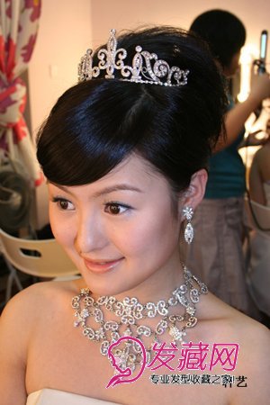 充分提现高雅端庄的新娘气质,长款头纱是最好的选择,随意盘起头发,将合适的头纱固定,搭配皇冠发饰,完美新娘造型简单搞定!成熟柔软的刘海,高贵的皇冠配饰,打造美丽新娘,但该款发型发髻稍显蓬松,缺少厚实感。