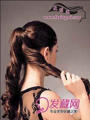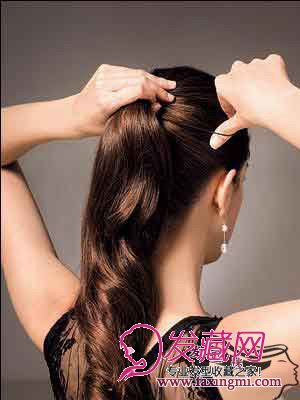 STEP2将全部头发分成三股,从右侧发束开始以逆时针方向拧转;