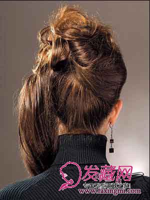 STEP3将发束依次按逆时针方向盘旋至头顶,注意位置一定要稍高些;调整发稍,尽可能将发梢卷曲的位置朝向前方,然后调整脑后的发束,以定型喷雾固定。