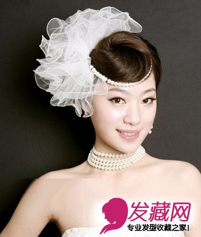 圆弧形的刘海发髻是亮点,利用珍珠链子头纱点缀刘海周围,非常的新意甜美。