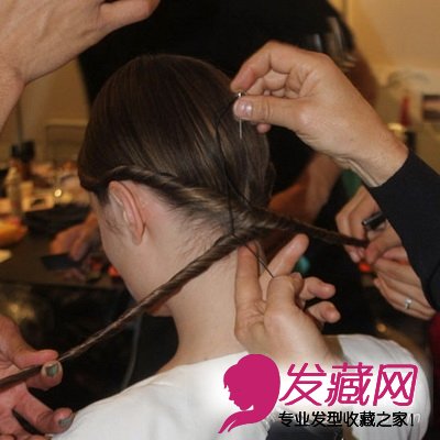当两侧的发辫都拧好后,先将拧好的发辫相互交叉,再用大号缝衣针在交叉点处穿过一根橡皮圈,最后将橡皮圈打结,以此来固定住发髻的基底。