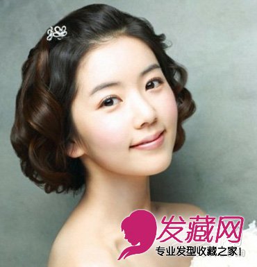 韩式新娘俏丽的短卷发,可爱甜美,而又有一丝小萝莉味道。头顶的小发饰增添浪漫感。淡淡的妆容清新动人。