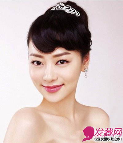 这是一款十分简单的复古式新娘发型,最为眼前一亮的在于刘海的设计,带着一丝挑染的设计,将皮肤衬托的完美白皙,拱形的刘海非常新颖,戴上新娘皇冠,打造 出一个精致的古典新娘。