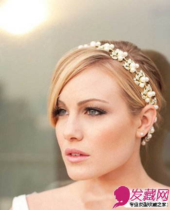 这一款新娘发型非常简约大方,斜刘海的新娘发型是很多女生都非常喜欢的,露出完美的轮廓。戴上珍珠发箍尽显优雅高贵,流露出端庄成熟的韵味。