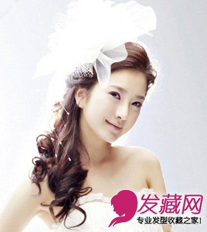 编辑点评:新娘发型不一定用扎发髻,中长卷的发型也可以非常好看,正如图中这款,大纱状的花饰飘逸华美,奢华大气,能提升整个新娘装的品位!