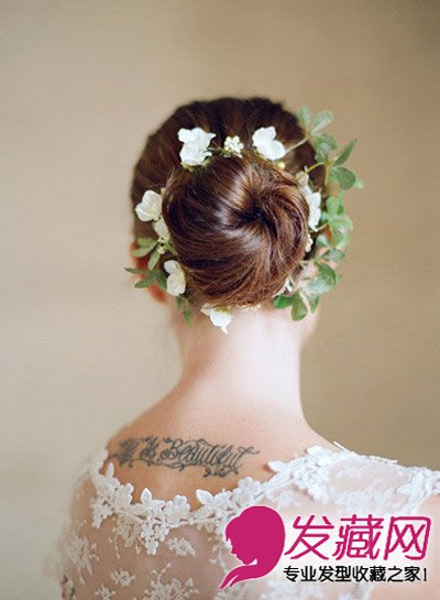 素雅的花朵特别适合草地婚礼场合,用白色小花朵和绿叶装饰最常见的圆发髻,既省时又精致。