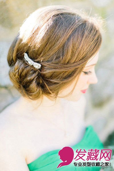 内卷式的发髻加上随风飘逸的发丝和一个闪亮发饰是夕阳海滩婚礼的梦幻组合。