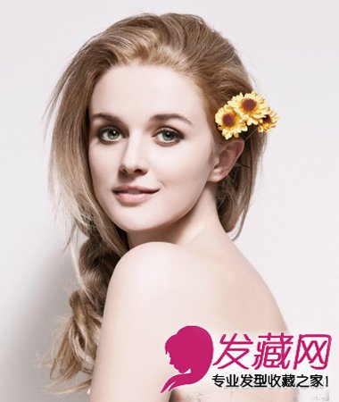 欧美范儿森女系新娘发型,简单的侧边扎发辫造型,金棕色发丝质感莹润显肤白,侧边扎发慵懒随意不造作,鬓间插花,清新浪漫的田园系。